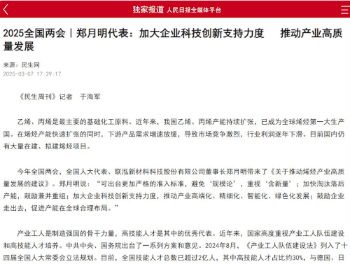 郑月明代表建议:出台越发严酷的行业准入标准,,,,,,控制乙烯、丙烯新增产能,,,,,,阻止“规模论”,,,,,,重视“含新量”,,,,,,并增强行业羁系力度,,,,,,确保相关政策落实到位;;;;;;;;加速镌汰落伍产能,,,,,,推动工业升级,,,,,,勉励企业通过吞并重组、产能置换等方法,,,,,,优化工业结构,,,,,,提高工业集中度;;;;;;;;加大企业科技立异支持力度,,,,,,推动行业高质量生长,,,,,,勉励企业加大研发投入,,,,,,举行手艺装备升级刷新,,,,,,提高产品附加值,,,,,,推动工业高端化、绿色化、差别化、细腻化生长;;;;;;;;勉励企业走出去,,,,,,增进产能在全球合理结构,,,,,,拓展生长空间。。。。。